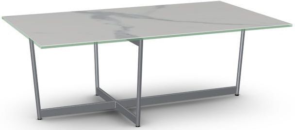 The Amisco Jill Italian Porcelain Coffee Table features Italian porcelain on a glass tabletop in a Statuario marble finish with a flat edge and an x-shaped metal frame. Additional tabletop and colour options are available from your local dealer.