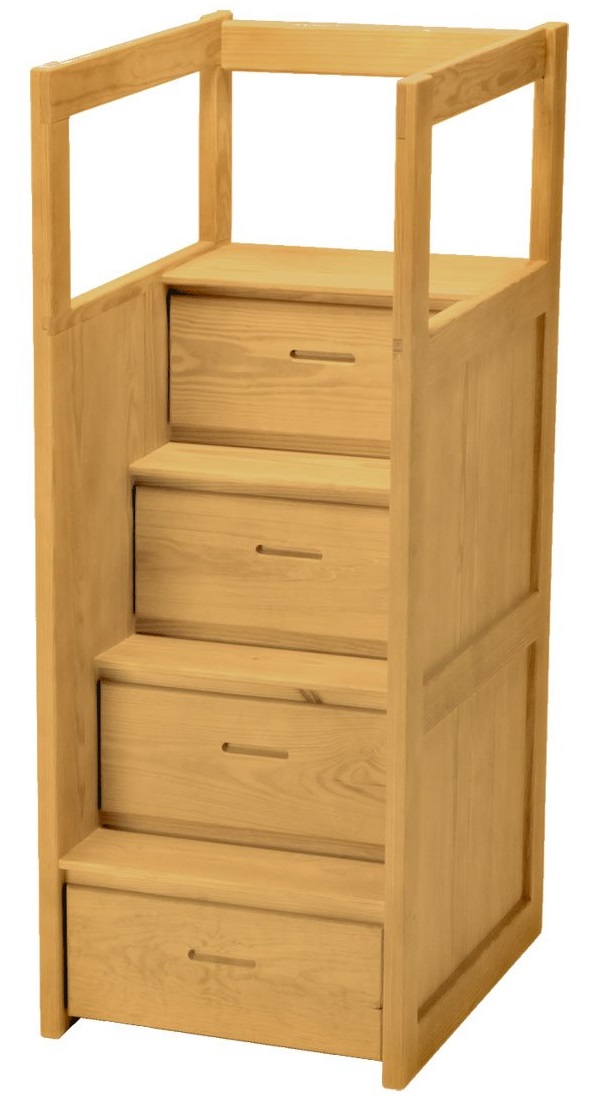 The staircase works well with all CD bunk beds - as well as your existing bunk bed. The staircase can be placed on either end of the bunk bed. Each drawer is the full depth of the cabinet. The bottom drawer rolls out on casters for full access!