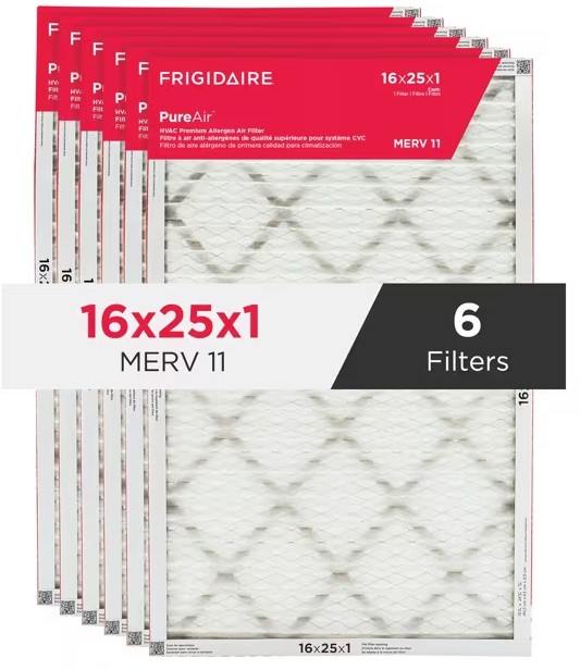 Enjoy cleaner, fresher indoor air with the PureAir® MERV 11 Premium Allergen Air Filter. This filter captures unwanted allergens and helps maintain optimal airflow in your home, filtering out airborne particles such as pollen, household dust, dust mite debris, carpet fibers, lint, pet dander, smoke, smog and more. A pleated design, electrostatic dual wire backing, and air flow indicator arrow provides high performance and simple installation. For best performance, replace every 3 months. 16x25x1 filter is compatible with standard residential furnace, air conditioner, or HVAC systems.Read More