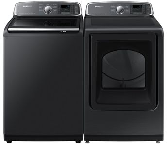 Samsung® Black Stainless Steel Top Load Laundry Pair with a 6.0 cu. ft. capacity washer and 7.4 cu. ft. capacity electric dryer.Read More